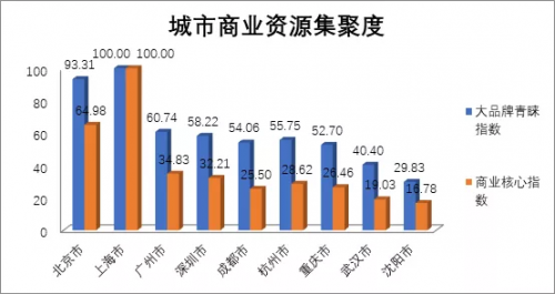 對于北京的夜經(jīng)濟(jì)來說,不缺少供“買買買”的消費(fèi)資源。我們以上海大品牌青睞指數(shù)為基準(zhǔn)(100),北京大約是93,僅次于上海,兩城商業(yè)資源集聚度遠(yuǎn)高于其他城市。廣州(60)、深圳(58)、杭州(55)、成都(54)、重慶(52)對大品牌商業(yè)資源的吸引力就差了很多。武漢(40)、沈陽(29)更是差距頗大。