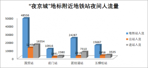 以前門和大柵欄、三里屯、國貿(mào)、五棵松首批“夜京城”地標(biāo)為例。地鐵延時(shí)運(yùn)營后,8月份地鐵1、2號線周邊夜生活人流量大約在13萬左右,我們選取離4個(gè)“夜京城”地標(biāo)最近的地鐵國貿(mào)站、前門站、團(tuán)結(jié)湖站和五棵松站進(jìn)行分析。